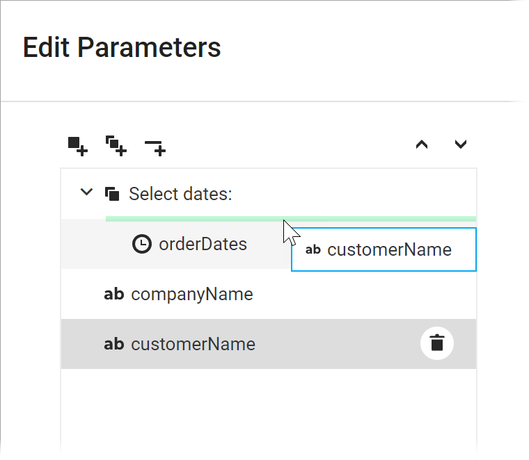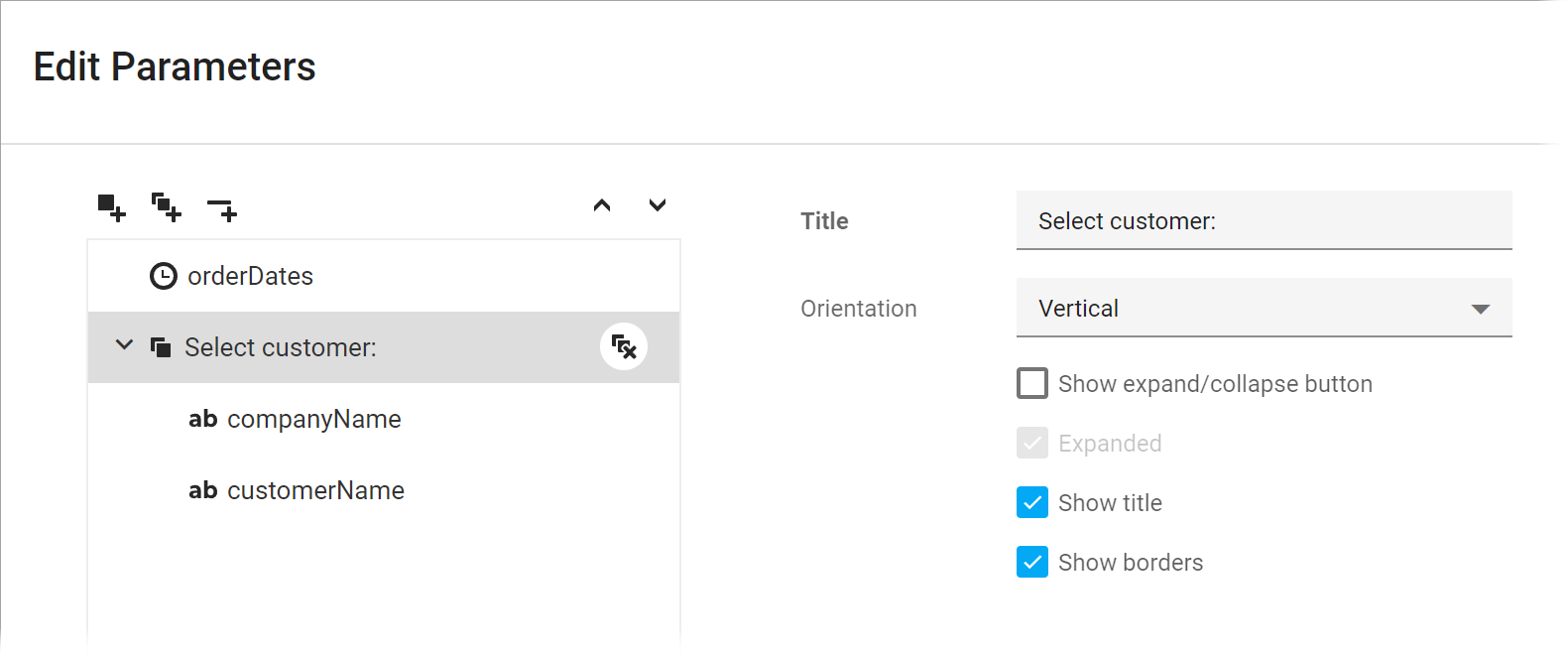 To customize a group, select it and use its editors on the right to set up the group appearance. The following example unites the customerName and companyName parameters into a group called Select a customer.